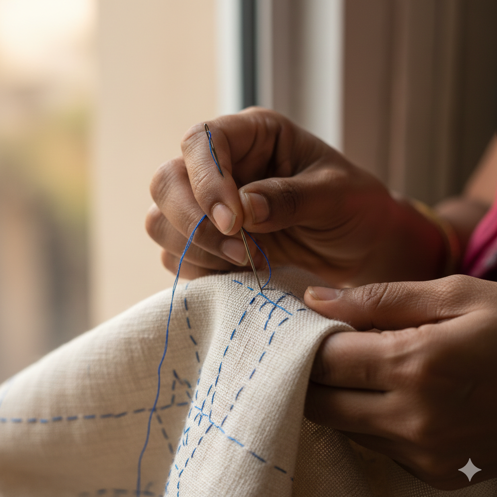 The artisan begins with the outline. Using the traditional kantha running stitch, she follows the transferred pattern, creating the skeleton of the design.
