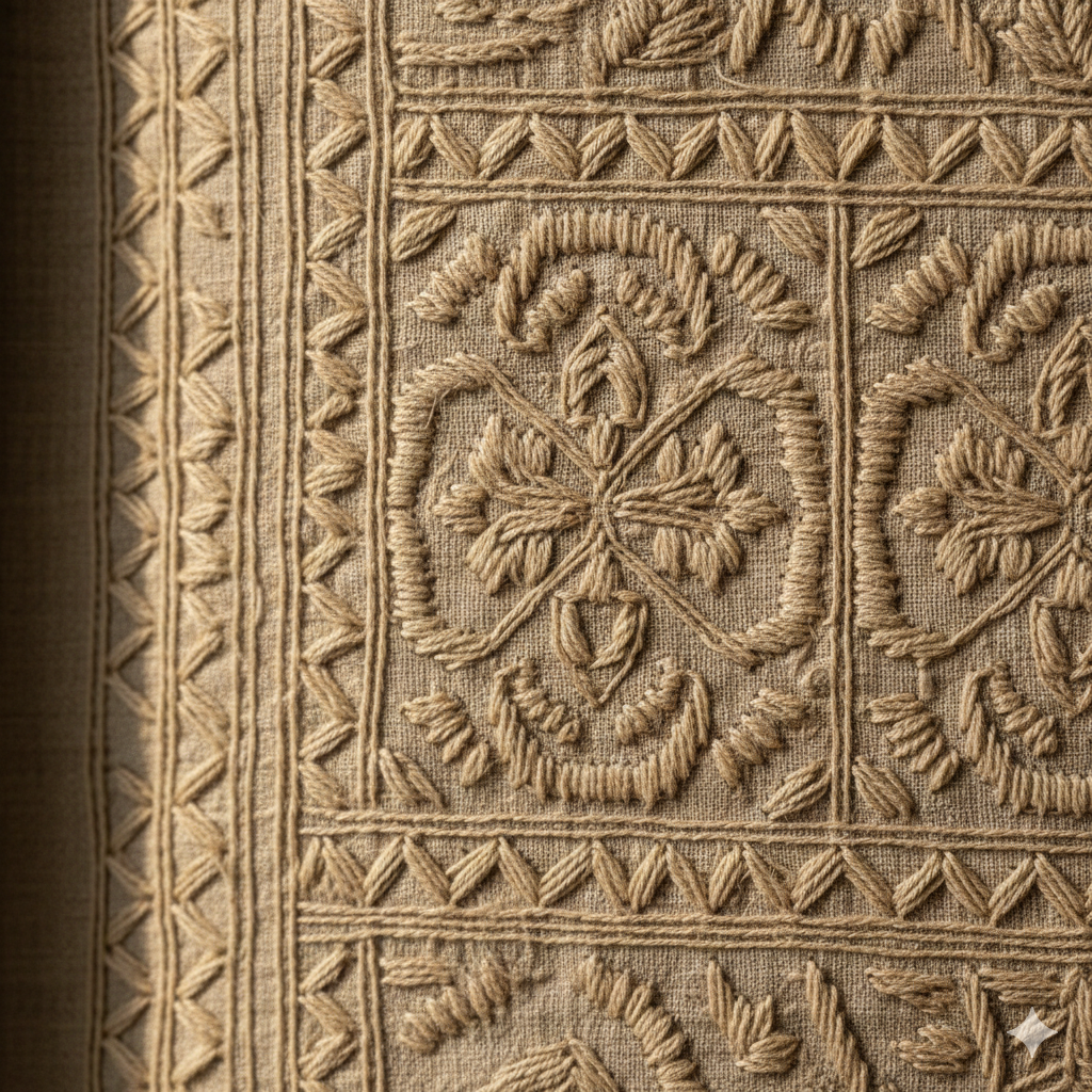 Traditional Nokshi Katha uses cotton thread—sometimes a single strand, sometimes multiple strands twisted together for dimension and depth.
