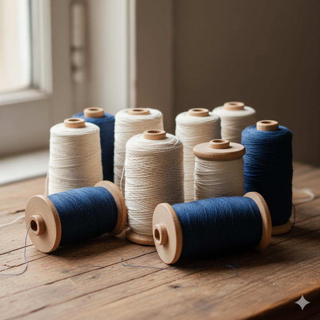 Our artisans prefer natural, undyed thread for most work, allowing the texture itself to create visual interest. For signature pieces in the Heritage Archive, we use indigo-dyed cotton thread that echoes our sapphire palette—a nod to tradition with a contemporary refinement.